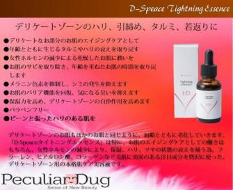 「D-Speaceタイトニングエッセンス」は特に、お肌のエイジングケアとしての働きはもちろん、女性ホルモンの減少により、保湿、ハリ、ツヤの状態の衰えを補う為、フラーレン、ヒアルロン酸、コラーゲンなど美肌に効果のある注目成分を贅沢に使った、デリケートゾーン用の本格肌ケア美容液です。