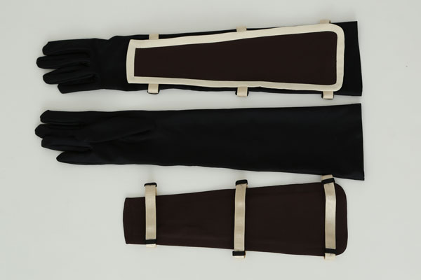 スカーフ留め、カフスのラインや、スカートの中心から外に向かうプリーツの形など、細