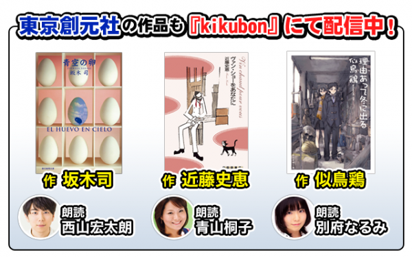 株式会社アールアールジェイ(所在地:東京都新宿区 代表取締役 橋満克文)は、株式会社東京創元社(所在地:東京都新宿区、代表取締役:長谷川晋一)より許諾を受け、2015年4月3日より、声優の声と演技で朗読するオーディオブックサイト「kikubon(キクボン)」http://kikubon.jp/にて、東京創元社作品「青空の卵(作:坂木司)」「ヴァン・ショーをあなたに(作:近藤史恵)」「理由(わけ)あって冬に出る(作:似鳥鶏)」の朗読の配信を開始致しました。