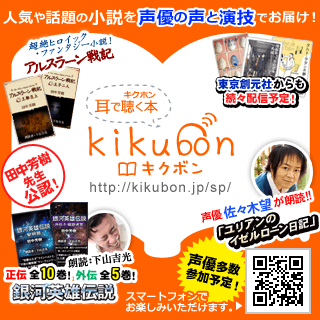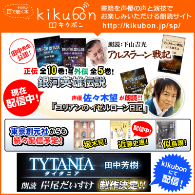 その他に、キクボンでは、田中芳樹先生の「銀河英雄伝説」「アルスラーン戦記」なども朗読化しており。今後は、「タイタニア」も岸尾だいすけ(青二プロダクション)により朗読化する。