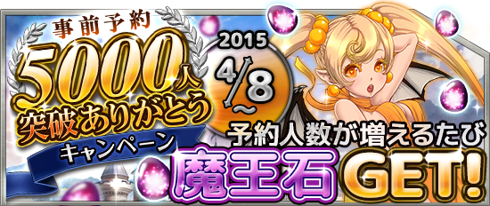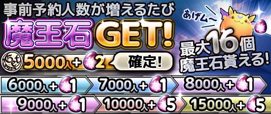 予約トップ10にて予約数が【10,000人】まで【1,000人】増えるごとに、魔王石を「+1個」追加でプレゼントさせて頂きます。更に【10,000人】到達で「+5個」、予約上限の【15,000人】達成で「+5個」追加いたします。