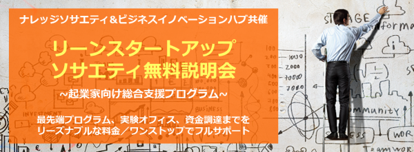 起業家向け会員制シェアオフィス・コワーキングスペース「KSフロア」を運営する株式会社ナレッジソサエティ(本社:東京都千代田区、取締役社長:久田敦史)は、ビジネスモデルデザインの支援サービスを提供するビジネスイノベーションハブ(本社:東京都練馬区、代表取締役:白井和康)との共催、リーンスタートアップを事業活動で実践している株式会社オズビジョン(本社:東京都千代田区、代表取締役社長:鈴木良)の協力のもと、2015年5月9日12週間にわたり、起業家向け総合支援プログラム「リーンスタートアップソサエティ」を開催いたします。本プログラムの開催に先立ち、3回にわたり無料説明会を行います。