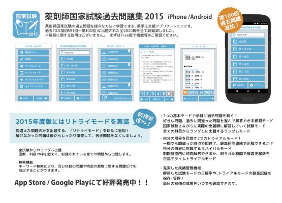 薬学生支援サイト「薬剤師国家試験対策.com」(http://be89314.com)は、Google Playストア・App Storeにて、2015年度版の「薬剤師国家試験過去問題集」アプリを公開致しました。