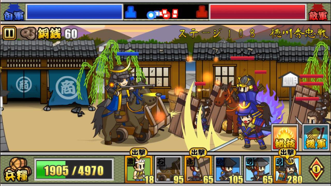 大殿のほか、真田幸村や黒田官兵衛などの「武将」、足軽・鉄砲・騎馬などの「兵」の3兵種を使い分けながら、合戦で勝利し手に入れた「銅銭」を使って武将や兵のステータスを上げ、全120ステージのクリアを目指しましょう。弥生時代、平安時代、鎌倉時代、室町時代・・・とステージが進むにつれ、登場する武将や兵が増え、遊び応えも満点です!