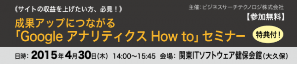 ビジネスサーチテクノロジ株式会社(本社:東京都千代田区、代表取締役社長:川邉雄司)は、成果アップにつながる「Google アナリティクス How to」セミナーを、2015年4月30日(木)に開催いたします。