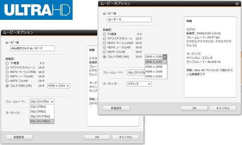 『みんなのフォトムービー7』は、フルハイビジョン (1920 x 1080) よりさらに解像度が高い Ultra HD (4K:3840 x 2160) に対応。