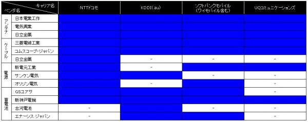 基地局向けアンテナやケーブル、電源、蓄電池といった附帯設備、いわゆる部材も無線機と同様に、需要や調達規模はキャリア各社の基地局計画に大きく左右される。大手3社の特徴としては、年度単位の計画を策定するNTTドコモとKDDI(au)、プロジェクト単位で動くソフトバンクモバイルに分けることができる。