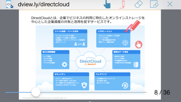株式会社Jiransoft Japan(本社:東京都新宿区、代表取締役社長:オ・チヨン、以下ジランソフト)は、同社が提供する企業向けオンラインストレージ「DirectCloud-BOX(ダイレクトクラウド・ボックス)」のオプションサービスとして、発表者がページを捲ったり、線を引いたり、画面に印をつけたりすることができ、その結果を参加者のデバイスに同期することが可能なプレゼンテーションアプリ「DirectCloud-VIEW(ダイレクトクラウド・ビュー)」を4月15日(水)にリリースします。