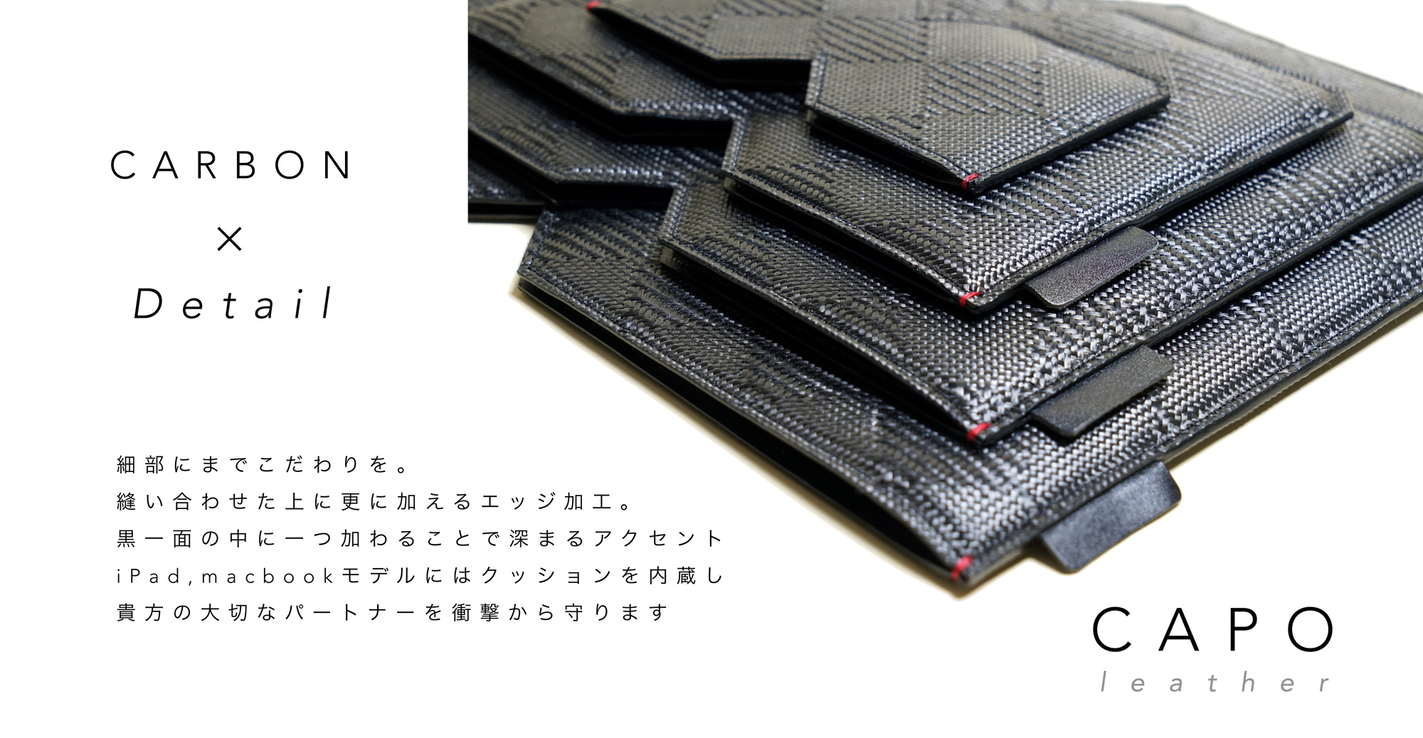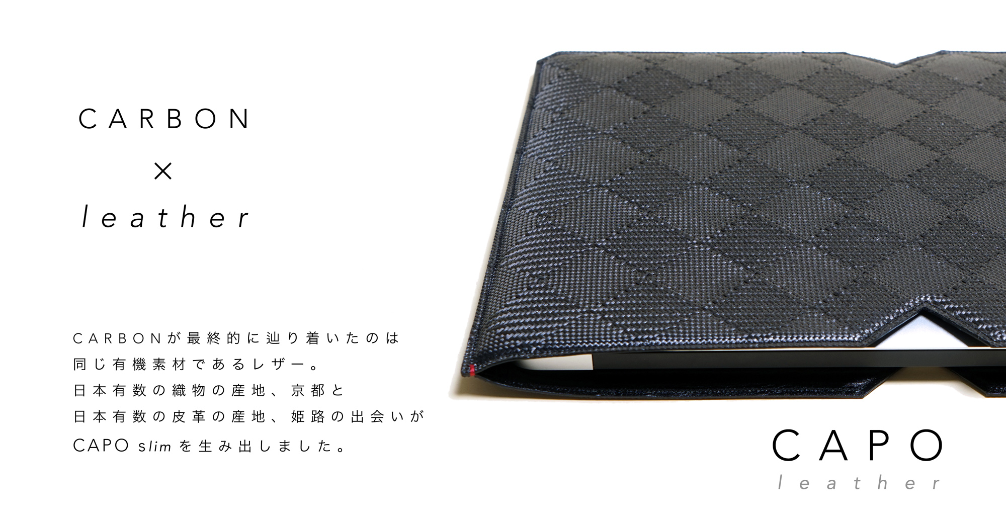 弊社はこの度、カーボンファイバーと西陣織とレザーを組み合わせたMacBook用ケース、「CAPO leather(カポ レザー http://ca-po.jp)」を発表いたしました。CAPO Leatherはを西陣織の技術を用いた伝統的かつモダンな市松デザインのカーボンファイバー素材と、 高級な質感を演出する国産の天然レザーを組み合わせた、全く新しいスタイルのMacBookケースです。