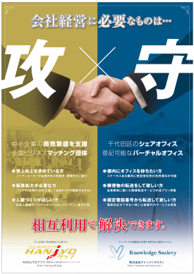 起業家向けシェアオフィス・コワーキングスペースを運営する株式会社ナレッジソサエティ(本社:東京都千代田区、取締役社長:久田敦史、以下、ナレッジソサエティ)と異業種交流会「HANJYOクラブ」を運営する株式会社タスクパートナーズ(本社:東京都新宿区、代表取締役:朝倉達矢)は、平成27年4月に業務提携を行い、会員の相互紹介、双方の強みを活かした新規会員の獲得活動を行います。