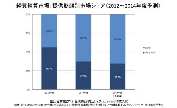 2012年度にはパッケージ(※2)での利用が過半数を占めた経費精算市場ですが、2013年度には37.7%に減少し、SaaS型の割合が62.7%に増加する結果となりました。(図2)さらに2014年度もSaaS型のシェアが引き続き拡大するという予測から、近年、国内企業においては経費精算システムの利用形態として、パッケージ型よりもSaaS型を選択する企業が増加傾向にあるということがわかります。こうした背景を追い風に、『楽楽精算』は2015年4月現在、累計導入社数は760社となり、今後さらに増加の見込みです。
