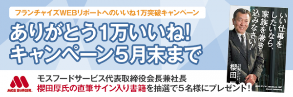 独立の中でも成功率が高いとされる『フランチャイズビジネス』の知識・オーナー募集情報がわかる「フランチャイズWEBリポート」は、この4月に公式Facebookページのいいね数がおかげさまで10,000を突破しました。『フランチャイズ』という画期的な手段をひとりでも多くの方にお伝えできればとの思いから、有名ハンバーガーチェーン「モスバーガー」の櫻田厚会長が執筆した書籍を直筆サイン入りで5名様にプレゼントさせていただくキャンペーンを開始する運びとなりました。