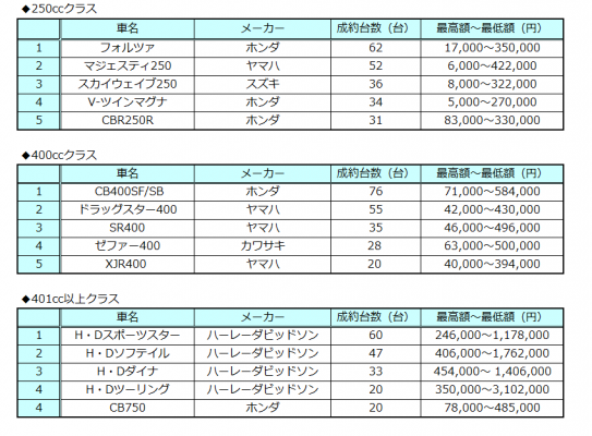 情報流通支援サービスの株式会社オークネット(本社:東京都港区/社長:藤崎清孝)は、 2015年3月度のオークネットバイクオークションにおける成約台数を集計し、排気量別ランキングベスト5をまとめました。
