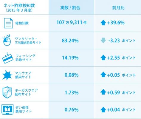2015年3月度はフィッシング詐欺サイト、ボーガスウエア配布サイトの検知が増えたため、前月と比べて総検知数が増加しました。