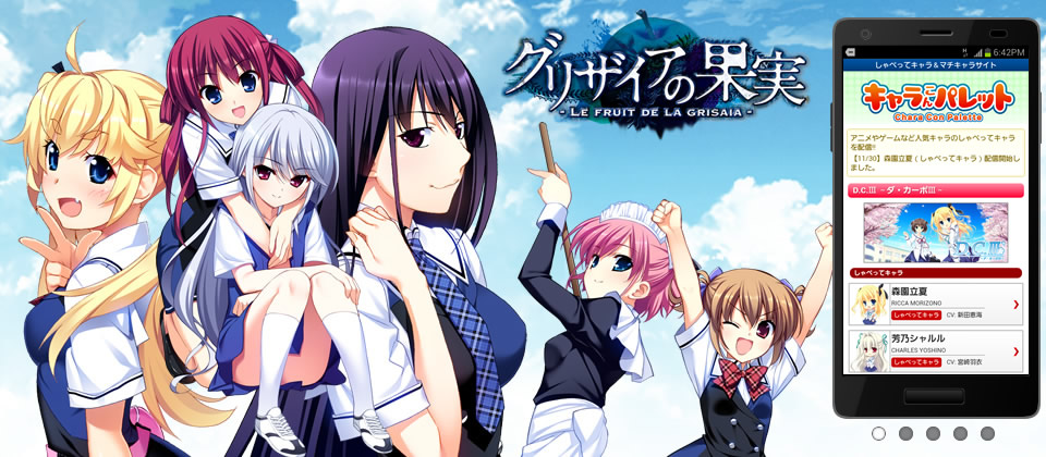 ※「グリザイアの果実」のヒロイン6キャラクターはしゃべってキャラ/マチキャラとして既に配信しておりますが、新規書き下ろしの画像による新バージョンを2014年12月(第一弾:周防天音)より配信開始しております。