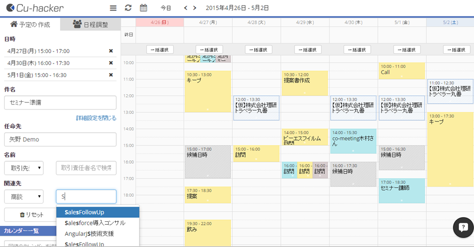 Cu-hacker for SalesforceはPCでもスマートデバイス(Salesforce1アプリ)でも利用できるアポイント調整を10倍速くするSalesforceユーザーに向けて開発した営業向けカレンダーサービスです。