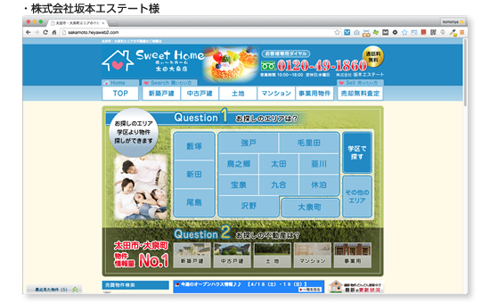 株式会社坂本エステート様は太田市を中心に幅広いエリアをカバーしております。エリア内では物件情報量No.1、宅建資格保有者4名が在籍する安心して相談できる地域密着型の不動産会社です。今回、メインイメージにおいては自由度が高い『仲介名人』のトップページの機能を活用し、広域地図から目的エリアと物件タイプを選ぶデザイン構成とし、効率的に物件検索ができるように工夫されたホームページになりました。