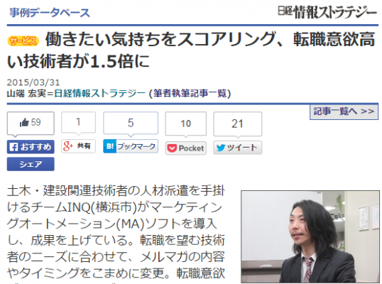 ※山端宏実記者(日経情報ストラテジー)のインタビューに応じた有益伸一は、取材当時、関連会社であるインキュベクス株式会社の経営企画部 マーケティングチームから チームINQに出向していましたが、現在はチームINQ人事本部 人材採用チームに転籍しております。