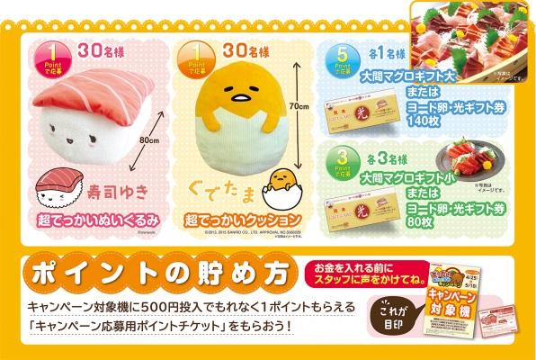こちらのポイントで人気の「寿司ゆき」や「ぐでたま」の“超でっかい”キャンペーン限定オリジナルぬいぐるみやクッションをはじめ、食卓を彩る「大間マグ ロギフト」や栄養たっぷり「ヨード卵・光ギフト券」の「まぐろ」「たまご」をテーマとしたステキな賞品が当たるWeb抽選に参加できます。