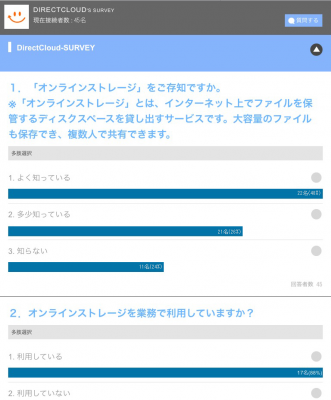 DirectCloud- SURVEYとは講演会、セミナー、展示会、研修など大勢の前で発表するとき、話しながらもアンケートを取り、ユーザーの反応をすぐに集計することができるリアルタイムアンケートサービスです。マルチデバイス環境でブラウザだけでアクセスできるので、いつでもどこからでも手軽に参加することができます。