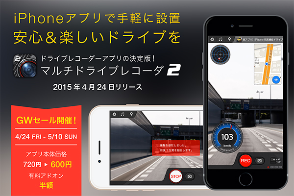株式会社 恭和(本社:静岡県静岡市、代表:太田則明)は、株式会社トライテック(本社:静岡県静岡市、代表:太田則明)と共同開発した、iPhone用多機能ドライブレコーダーアプリ「マルチドライブレコーダ2」を2015年4月24日(金)にリリース致します。リリース特別価格としてGW期間中(2015年4月24日~5月10日)アプリを600円(通常価格720円)、有料アドオンを半額にて提供致します。