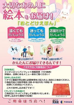 株式会社トーハン(本社・東京都新宿区、藤井武彦社長)は、絵本のプレゼント需要、店頭への送客強化のため、客注専用システム「本の特急便」を活用した新たなサービス「おとどけえほん」を4月23日より全国1,200軒でスタートいたします。