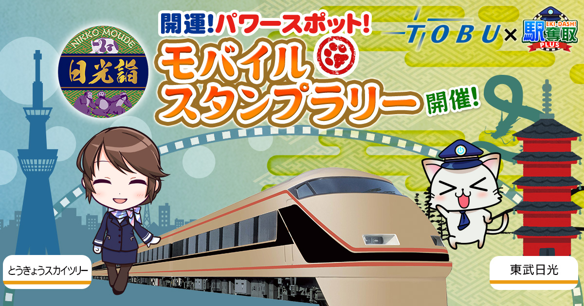 本イベントは、「TOBU×駅奪取 開運!パワースポット モバイルスタンプラリー」と題し、東京スカイツリータウンから日光への東武鉄道沿線の観光を楽しみながら気軽にスタンプラリーができるデジタルスタンプラリーです。