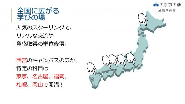 現在2015年度4月入学後期出願受付中の「教養が深まるオンライン大学」大手前大学通信教育部は、2015年度より、スクーリング会場を東京・兵庫・名古屋・福岡・札幌・岡山と全国へ拡大しました。