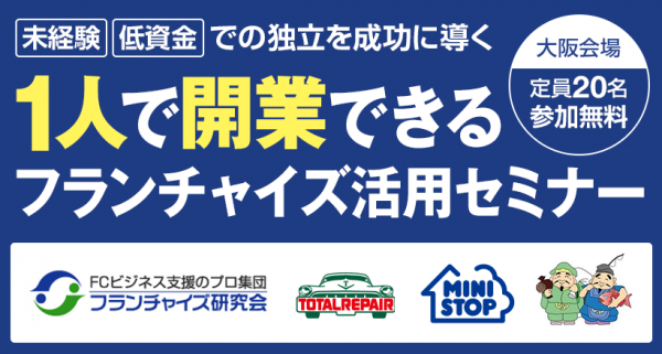独立の一手段、フランチャイズの募集情報を掲載する「フランチャイズWEBリポート」(株式会社Dai )は、2015年5月13日(水)に大阪で、5月20日(水)に東京で、それぞれ『1人で開業できるフランチャイズ活用セミナー』を開催します。