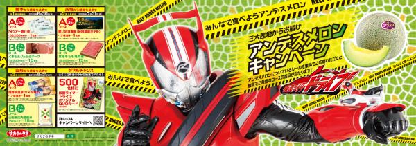 キャンペーンキャラクターには、全国テレビ朝日系にて絶賛放送中の人気番組「仮面ライダードライブ」の主人公「仮面ライダードライブ」を起用しました。スーパーの青果売場やWebなどの各ビジュアルに登場します。仮面ライダーが大好きな小さなお子さんから、それをいっしょに見る親御さん、そしてメロンを買って孫の笑顔が見たいおじいちゃんおばあちゃんまで、「アンデス」は幅広い層に親しんでいただけるものとなっています。