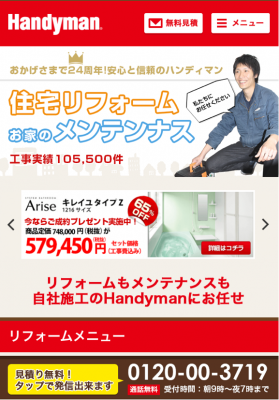 高品質・高性能で健康と環境に配慮したパッシブデザインリフォームの株式会社OKUTA(オクタ:本社 埼玉県さいたま市 会長 奥田勇)は、2015年4月30日、住まいのリフォーム・住生活サポートサービス「Handyman」のスマートフォン専用サイトをOPENしました。「Handyman」のリフォームメニューや生活サポートサービスを、PC版と変わらないボリュームで、より分かりやすく簡単にご覧いただけます。移動中・家事の間・トラブル発生時など、いつでもどこでも簡単に確認することが可能です。