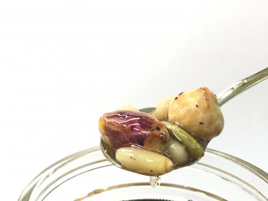 デトックスで有名な「ナッツの女王」と呼ばれるピスタチオ、抗酸化物質たっぷりのヘーゼルナッツ、モデルの間食として人気の松の実、亜鉛やビタミン豊富なパンプキンシードの4種類の華やかな"薫る"ナッツに、隠し味に黒こしょうを加えたキラキラスイーツ「エトワール」、ついにできました。
