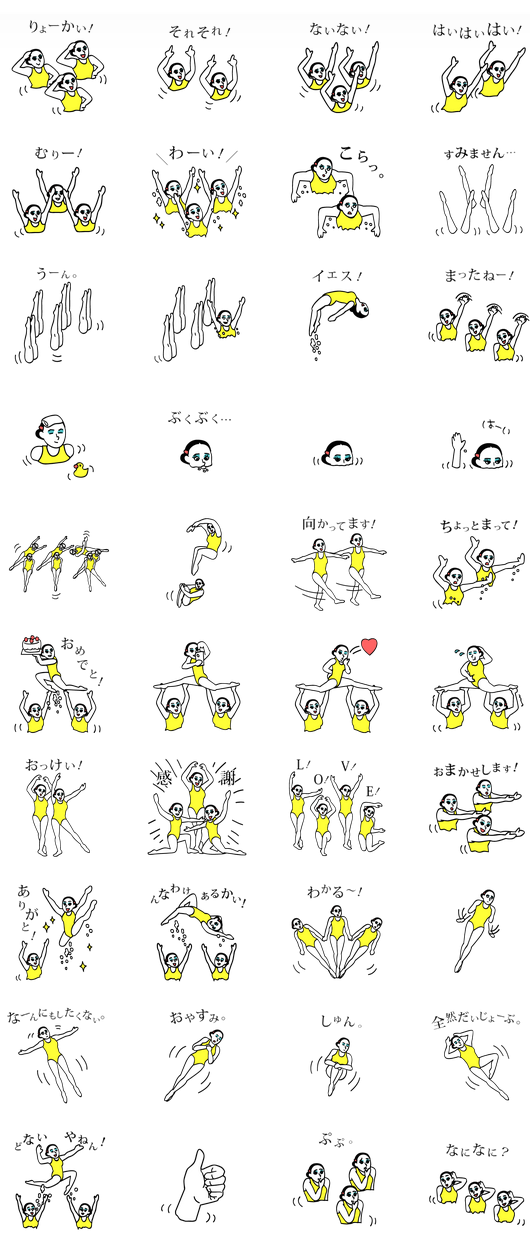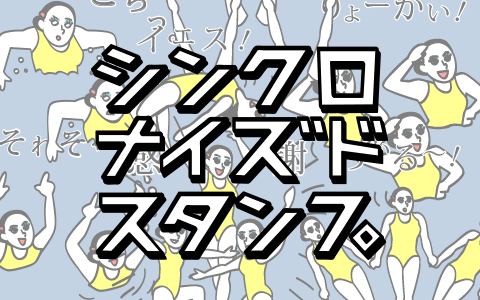 「シンクロナイズドスタンプ」は弊社オリジナルのスタンプです。シンクロナイズドスイミングの選手をモチーフにしたスタンプです。LINEの中でシンクロするように、あなたの気持ちをシンクロナイズドスイミングで表現します。
