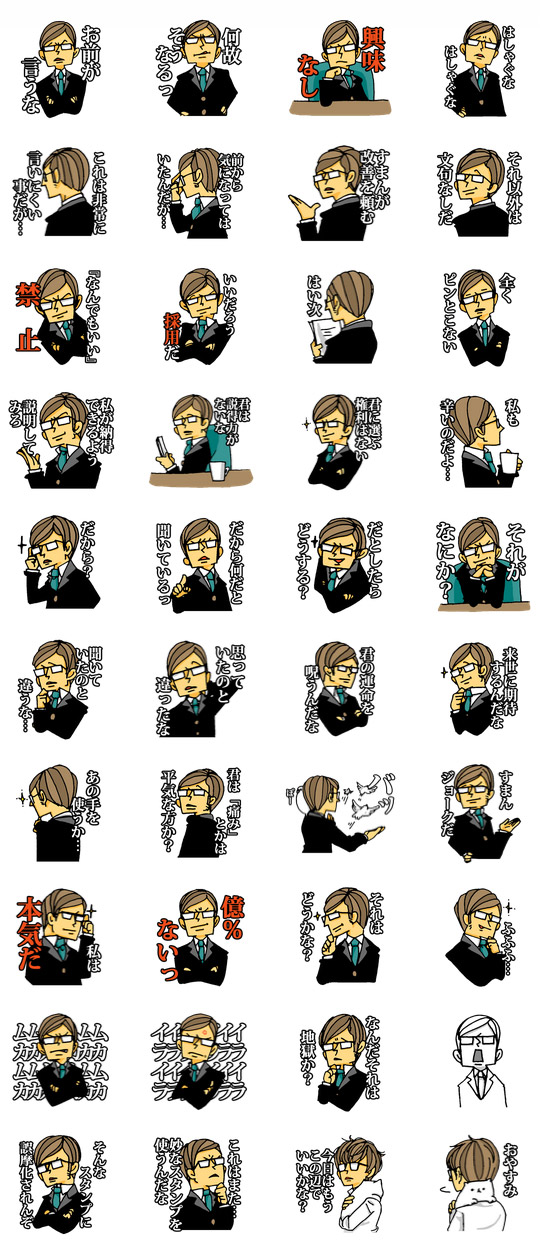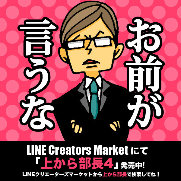 「上から部長4」は弊社オリジナルのキャラクターです。ゆるやかに高飛車な態度で周囲をイラつかせる「上から部長」シリーズのスタンプ第4弾です。今回は原点回帰の意味を含めて、上から目線でものを言う部長のセリフを強化しました。