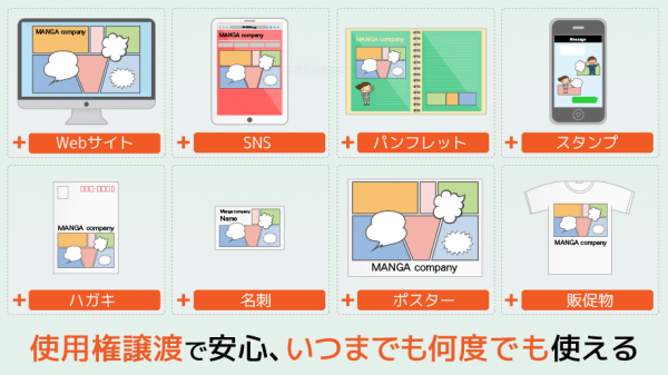 納品したマンガ広告は使用権が譲渡されて、ウェブでもパンフレットでも何でも自由に使い回せるという特徴があります。例えば、チラシに使う漫画やイラストを発注いただくだけで様々な媒体への再利用が可能です。