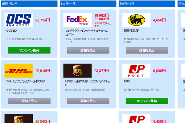 料金検索: FedEx, DHL, UPS, OCS, 国際宅急便, EMS, 国際郵便など
