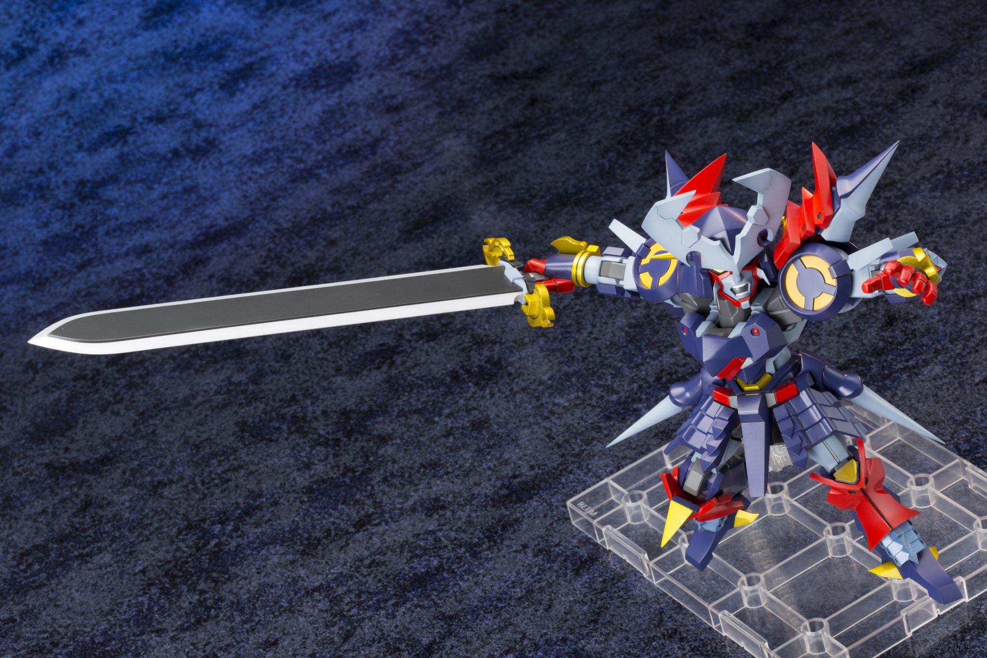 剣撃に特化した特機らしく、刀を構えたポージングが映える可動ギミックが特徴的なプラモデルです。ダイゼンガーの印象的な武器「参式斬艦刀」は、通常時・展開時の2種類が付属、展開時には全長250mmと本体を超える巨大な斬艦刀を構えたポージングも可能です。また、表情パーツも一部塗装済みで通常顔と咆哮顔の2種類が付属します。さらにコトブキヤショップ(秋葉原館、大阪日本橋、オンラインショップ)限定で、リアリティある仕上がりになる「ドレスアップメッキパーツ」が特典として付いてきます。