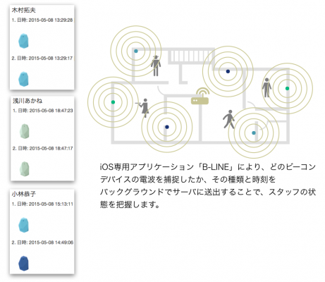 あらかじめ建物のフロアマップ画像を管理システムに登録の上、実際の各部屋の任意の場所にもビーコンデバイスを設置することで、その付近にいるスタッフの携帯するiOSデバイスの情報を取得することで、スタッフがどこにいるかを把握できます。