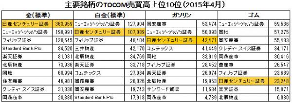 日産センチュリー証券(所在地:東京都中央区 代表取締役社長:二家英彰)の、東京商品取引所(以下、TOCOM)における2015年4月の取引実績を下記の通りお知らせいたします。