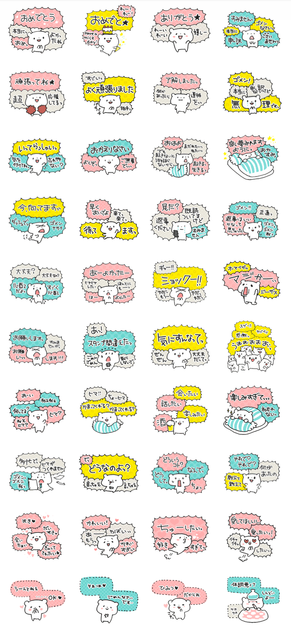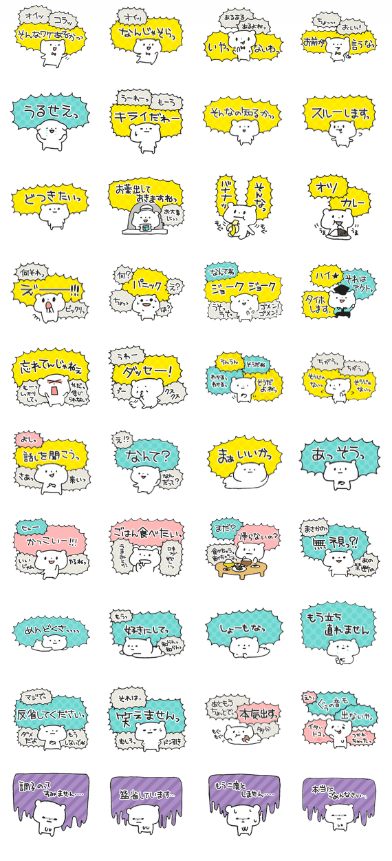 「うるさクマ1」は日常会話が主流で使いやすいものになっています。同時リリースの「うるさクマ2」は「ツッコミ」などの遊びのスタンプが豊富です。個性が強いので普通のスタンプに飽きてちょっと変わったスタンプが使いたい方にオススメです。1・2合わせて使っていただきたいスタンプです。