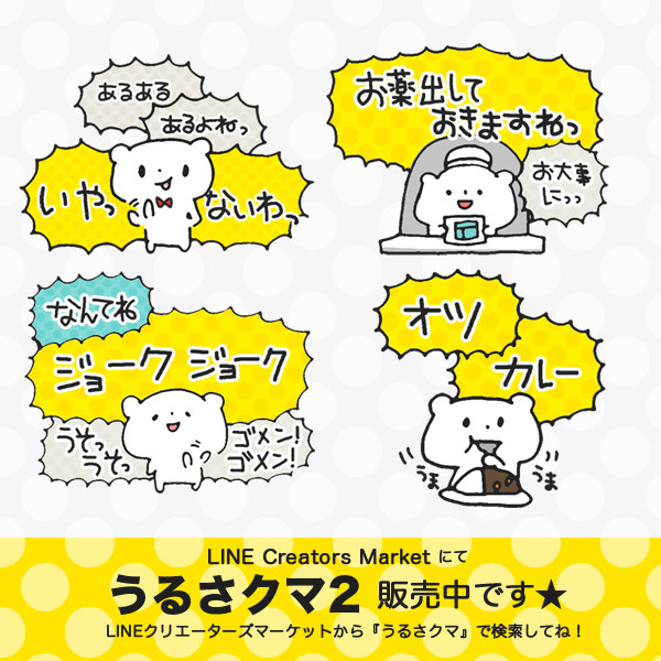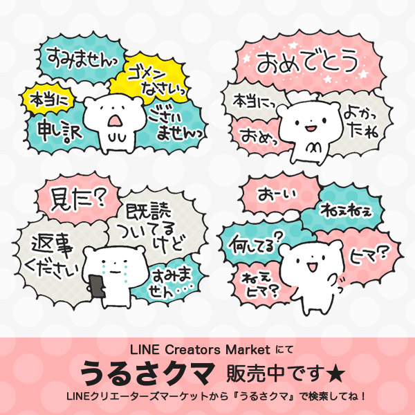 「うるさクマ」は弊社オリジナルのスタンプです。かわいいクマをモチーフに一つの言葉に二言三言多く付け足した主張の強いスタンプです。一つのスタンプでメインのセリフをより際立たせたり、フォローをしたりと機能的な面も持ち合わせています。