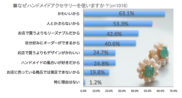 ハンドメイドを使う方の理由としては「かわいいから」63.1%(n=641)が最も多く、次いで「人とかぶらないから」53.3%(n=542)「お店で買うよりもリーズナブルだから」42.6%(n=433)が挙げられました。