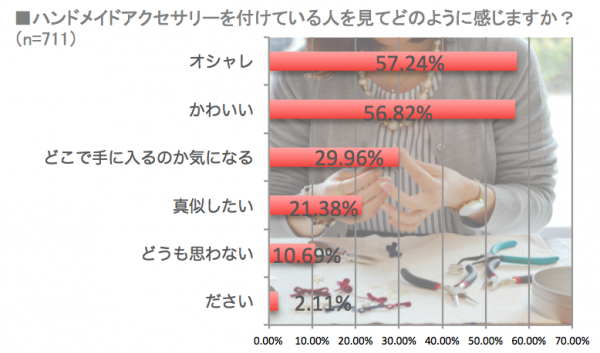 身の回りにハンドメイドアクセサリーを付けている人がいると応えた711名を対象に、「ハンドメイドアクセサリーを付けている人を見てどのように感じますか?」と質問したところ「オシャレ」57.24%(n=407)と最も多く、次いで「かわいい」56.82%(n=404)、「どこで手に入るか気になる」29.96(n=213)の順となりました。