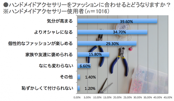 ハンドメイドアクセサリーを身につけることでどのような影響が有るかを質問したところ「気分が高まる」39.4%(n=549)と持っとも多く、次いで「よりオシャレになる」34.70%(481)、「個性的なファッションが楽しめる」29.30%(n=407)が続きました。