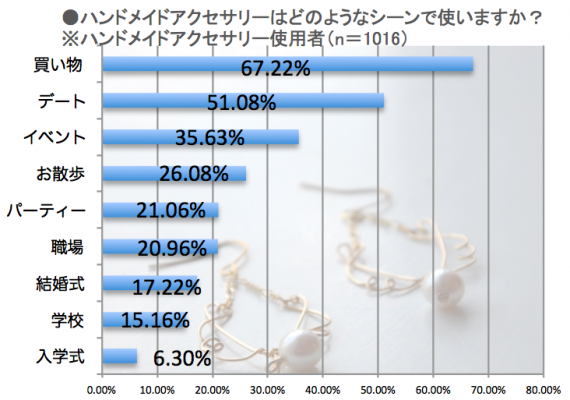 ハンドメイドアクセサリーをどのような場で使っているのかを質問したところ、「買い物」67.22%(n=683)が最多となりました。次いで「デート」51.08%(n=519)、「イベント」35.63%(n=362)となりオシャレをする場での利用実態が多い事が分かります。