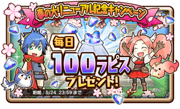 内容:ログイン時に100ラピスをプレゼントいたします。お知らせからお受け取りください。