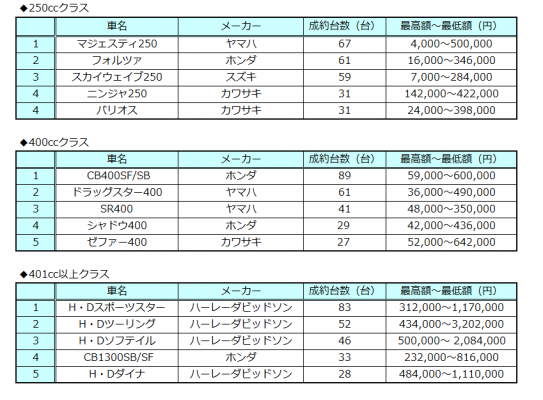 オークネットバイクオークション4月成約排気量別ランキング