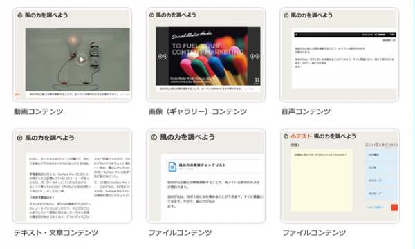 といったマルチメディア教材を「教材集」として簡単に作成し、アプリへ配信できます。