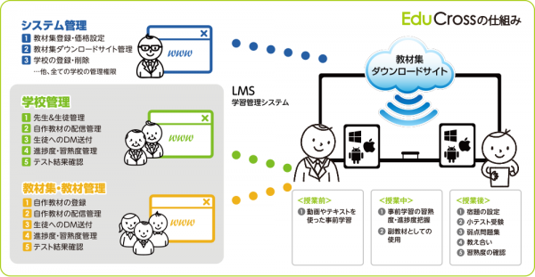 従来のサービス「EduCross」は、インターネットを通じWEBブラウザから、動画・画像・ドキュメント・テスト・レポート・アンケートを簡単に作成し、タブレット端末に配信するサービスでした。これまでのお客様から頂戴したご要望をもとに、この度インターネットを介さず、閉域網経由でご利用できるプランをご提供いたします。