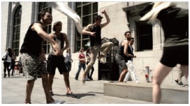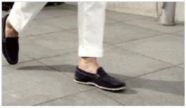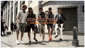 さっそうと歩く5人の男性。Tシャツやジャケット、ハットなどをどんどん着用していきながら街を歩きます。街中でも他に引けを取らない夏ならではのスタイリング。その足元を彩るのは「STEFANOROSSI SUMMER COLLECTION」。